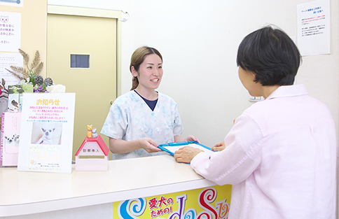 ウチダ動物病院の入口に入っていただくと、すぐ正面が受付になります。お越し頂きましたらお気軽にスタッフへお声がけください。