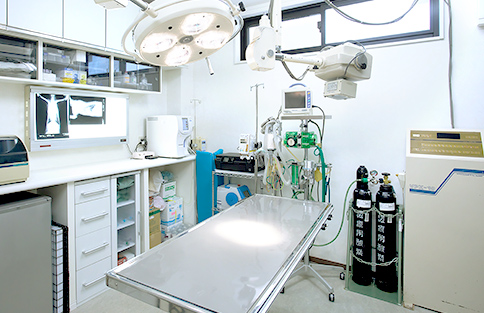 手術を行う際は、こちらの手術室で獣医師によって行われます。清潔に保たれた専門機材も揃っていて、万全な体制で手術が行われます。