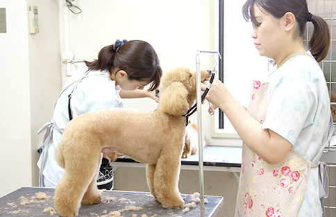ワンちゃん、ネコちゃんのトリミング専用のお部屋です。ここで爪切り、シャンプー、カットなどトリミングのコースをします。
